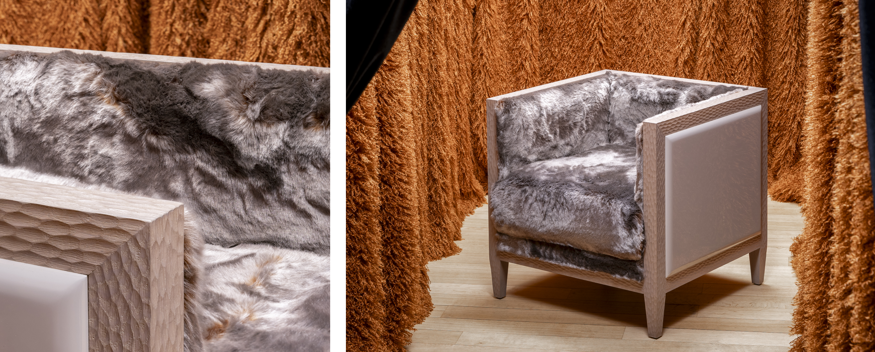 Sophie Dries takes hold of the Inwood armchair, transforming it into a sculptural presence, both discreet and powerful. Playing with contrasts between structure and softness, restraint and expressiveness, her creation naturally integrates into the exhibition’s immersive scenography. Curtains in Azur Cotonneux, a sophisticated faux fur, envelop the piece, while the armchair itself is upholstered in Montparnos fabric, with its bold and textured character.