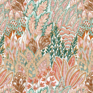Along the River Congo, the Salonga Reserve is a natural reserve composed of a mosaic of rivers. The peaceful lakes are surrounded by lush vegetation. The water is represented by velvets, jacquards and voiles. They are defined by the matte and shiny interplay, their iridescent highlights and exquisite contrasts. The linen cloths welcome stylised plant embroideries, in kaleidoscopes of natural shades. The cotton satin is filled with a spectacular floral design. Embroidered in deep tones, lifted by a luminous white yarn the plants move elegantly to the rhythm of the kumba. A true ballet of plants, this choreography of foliage carries us far away, on the hot African wind.