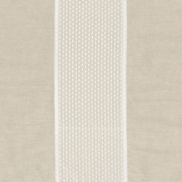 Une large rayure formée d’entrelacs brodés rythme un élégant satin de coton et lui confère un caractère graphique. Inspiré par la verrière de la Samaritaine, bâtiment art déco conçu par Frantz Jourdain, le tissu est proposé en quatre références. Deux d’entre elles sont réalisées en ton sur ton, deux autres sont marquées par le contraste d’un fil Noir de lune sur fond ivoire ou mordoré.